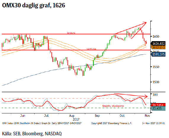 Till slut så tog ett allt sämre moment, dvs. mindre och mindre uppgång efter varje ny topp, ut sin rätt och korrektionen var ett faktum. Den nu bekräftade negativ divergensen (ny topp i pris, lägre topp i indikator) bekräftar också att vi nu har äntrat en något kraftigare korrektionsfas. Vi söker en studs från 55d mv bandet men därefter ytterligare nedgång. Det återstår att se om de annalkande PPM pengarna kan ha en positiv påverkan när vi kommer en bit in i december. En stängning i november under 1634 skapar en månadssäljsignal likt den som skapades i juni och skulle i sådana fall ytterligare förlänga nedgångsfasen/potentialen.