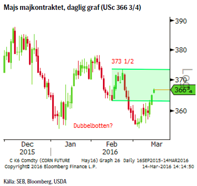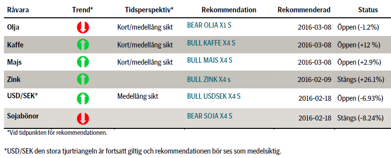 Råvaror: Förra veckan sällade sig EIA till den grupp som hävdar att det värsta nu är bakom oss och att en mer bestående botten har satts. Vi är dock fortfarande lite tveksamma till denna konklusion och håller dörren öppen för förnyad prispress (om denna leder till en ny botten eller inte är dock en öppen fråga). Skulle mötet i Ryssland den 20:e mars inte utmynna i en överenskommelse om att frysa produktionen (där inte Iran tänker delta förrän de når en produktion om 4m fpd) så kan vi se ett nytt snabbt prisfall. Guldet fortsätter att visa svaghet och vi förväntar oss fortfarande en nedgång i närtid. Basmetallerna ser också ut att ha tappat farten vilket ökar risken för förnyade försäljningar. Kaffe, socker och majs visar dock klara tecken på att fortsätta högre.