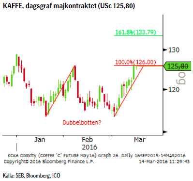 Förra veckan prognostiserade den internationella kaffeorganisationen, ICO, att säsongen 2015/2016 kommer att bli ett underskottsår avseende skörderesultatet. Underskottet förväntas dock att fyllas av sedan tidigare år lagrade bönor. Rabobank, som nyligen gjort en på platsen studie i Brasilien, räknar också med en produktion under konsensus, detta pga. utdragen torka (minskad produktion av robusta och ökad av arabica, dock under marknadens förväntningar avseende båda).
