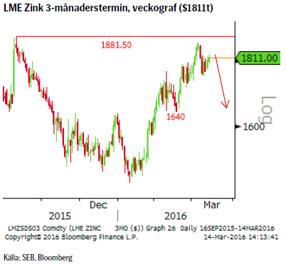 Även om vi är medel – långsiktigt positiva till zink så ser rally allt mer överköpt ut. Vi tar därför vinst på den rekommenderade långpositionen men söker också ett nytt, billigare, läge att åter gå lång. Enligt statistik från LME så har också förvaltare kraftigt ökat sin långa position sedan botten i mitten av januari varför en rekyl nu riskerar att tvinga ut en hel del material i marknaden. Kinesisk PMI och industriproduktion har inte heller rosat marknaden med några positiva utfall vilket ytterligare gör att vi misstänker att finansiella flöden ligger bakom mycket av uppgången. Så även om vi är positiva anser vi att marknaden har prisat in lite för mycket lite för fort.