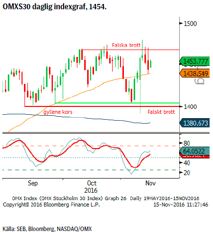 Brottet under stödområdet visade sig bli ett falskt brott och följaktligen en positiv signal. Markanden har därefter handlat upp priset till ett nytt årshögsta. Vi är dock besvikna på prisutvecklingen ovanför 1473 då nya toppar bör leda till förstärkt köpande och inte som i detta fall försäljningar. Även momentum-indikatorer varnar genom att, än så länge, inte ha satt nya toppar. Den kraftiga uppgången i obligationsräntor är också ett orostecken som nogsamt bör bevakas.