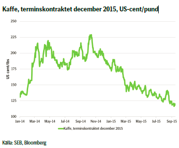 - Mot bakgrund av oförändrad fundamenta och den kraftiga försvagningen av valutan tror vi på fortsatt lägre kaffepris