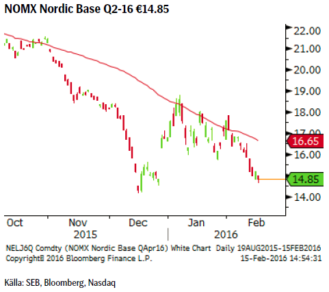 Så börjar vintern så sakteliga gå mot sitt slut och slutet verkar enligt prognoserna bli både mildare och med något mer nederbörd än normalt. Följaktligen så ser vi inte någon större potential för elpriset att i närtid röra sig uppåt (och skulle det göra det så bör det snarare ses som ett säljläge). Det mest troliga är att vi fortsätter handla i den lägre delen av det intervall som utvecklats sedan mitten av december, €14 – 18.