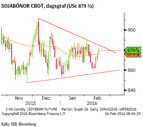 Råvaror: Större delen av veckan karakteriserades av fallande priser vilka dock till viss del reverserades under fredagen. Eventuellt spelade täckning av korta positioner inför den amerikanska långhelgen (måndag = President’s Day) en viss roll. Dock bör beteendet bevakas noga då det finns en tendens till att en marknad som är kort och som börjar minska risk på fredagar ofta befinner sig i ett förstadium till en större korrektion. Nymex lättolja skapade ett falskt veckobrott på nedsidan, koppar har skapat en möjlig, men inte bekräftad, bottenformation och soja ser ut att närma sig ett kommande utbrott på nedsidan.