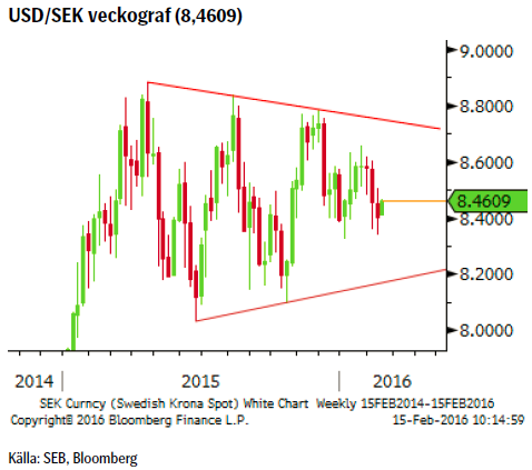 Valuta: Riksbankens reporäntesänkning blev större än förväntat vilket initialt försvagade kronan som dock sedan dess återhämtat sig något. Dollarn var fortsatt svag under större delen av veckan men tog tillbaka en del styrka under fredagen (är rekylbotten nu nådd?). Yen-förstärkningen utlöste en våg av stoppar då USD/JPY bröt under 116.