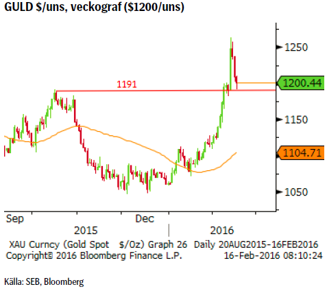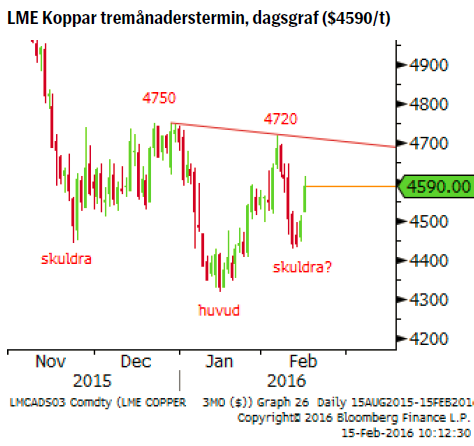 Råvaror: Större delen av veckan karakteriserades av fallande priser vilka dock till viss del reverserades under fredagen. Eventuellt spelade täckning av korta positioner inför den amerikanska långhelgen (måndag = President’s Day) en viss roll. Dock bör beteendet bevakas noga då det finns en tendens till att en marknad som är kort och som börjar minska risk på fredagar ofta befinner sig i ett förstadium till en större korrektion. Nymex lättolja skapade ett falskt veckobrott på nedsidan, koppar har skapat en möjlig, men inte bekräftad, bottenformation och soja ser ut att närma sig ett kommande utbrott på nedsidan.