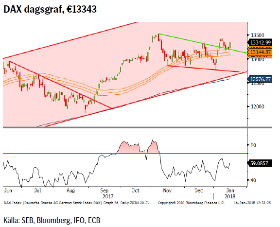 Den senaste lilla dippen ska ses som ett återtest och bekräftelse på uppbrottet ur och från den senaste tjurflaggan (och 55d mv bandet). Om historien är någon guidning så ska vi nu idealt fortsätta upp mot nya toppar. Egentligen så är det väl bara om regeringsförhandlingarna i Tyskland havererar och/eller en storstrejk bryter ut som skulle vara till skada för DAX. På den positiva sidan noterar vi också att bankindex för eurozonen har brutit upp från en sex månader lång konsolidering.
