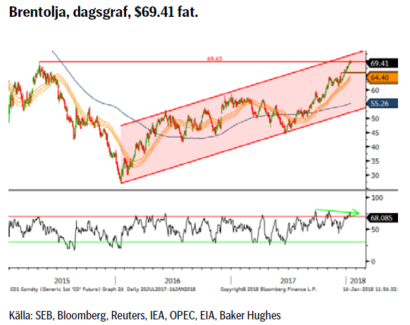 Oljepriset har sedan förra veckan fortsatt att stiga och har marginellt men temporärt passerat motståndet vid $69.63 och verkar också än så länge möta viss försäljning över $70/fat. Amerikanska skifferproducenter försöker öka produktionen för att kunna dra nytta av det högre priset 18m (vilket är en vanlig period för prissäkring) WTI olja handlas för tillfället strax över $58/fat. Dock gör flaskhalsar som utbildad arbetskraft att kostnaderna nu stiger. Merparten av aktörerna ser kraftigt stigande kostnader under 2018.