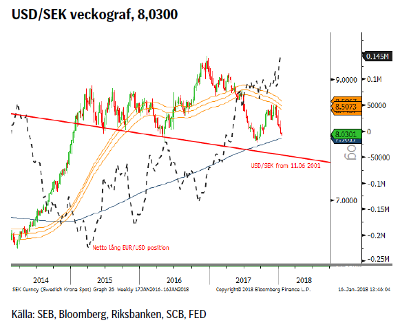 Vad gäller amerikansk inflation ska man nog nu börja hålla ögonen på eventuell löneinflation. T.ex. så höjde vid årsskiftet 18 delstater sina minimilöner och häromdagen meddelade Walmart att man inte bara höjer minimilönen utan också delar ut bonus samt bygger ut föräldraförsäkringen. Den amerikanska arbetsmarknaden beter sig mer och mer som att den har blivit riktigt tajt, något som bör elda på löneinflationen. Risken ökar alltså att vi kan få överraskningar på inflationsområdet. Den rekordstora lång euro/kort usd positioneringen är ett varningstecken att dollarförsäljningarna kan komma att lätta.