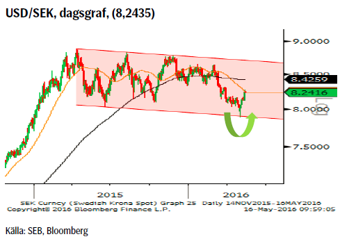 - Troligtvis en ökad ränteskillnad då FED förväntas fortsätta att höja sin styrränta långt tidigare än Riksbanken (som enligt SEB ska göra en första höjning (dvs. minska den negativa räntan) i februari 2017).