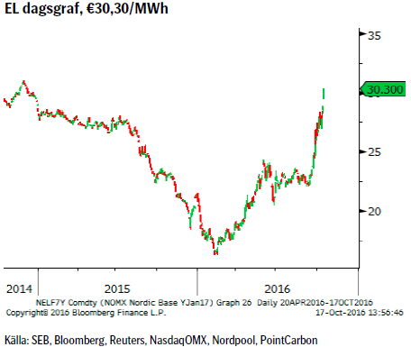 Uppgången i elpriserna har fortsatt med oförminskad styrka (efter en liten andhämtning i början av förra veckan). Hydrobalansen fortsätter att försämras givet det torra vädret och tillrinningen till vattenreservoarerna har följaktligen mer eller mindre avstannat. Priset på kol och utsläppsrätter har även de fortsatt att stiga vilket lyfter golvet för elpriserna.