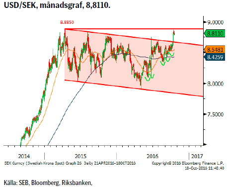 Kombinationen av starkare dollar och svagare krona har gjort susen för USD/SEK-kursen som förra veckan tog ett stort kliv norrut, passerandes den fallande trendlinjen från toppen 2015. Då förra veckan stängde ordentligt ovanför trendlinjen får vi anses att brottet är bekräftat. Nästa steg bör därför vara att utmana förra årets topp, 8,8850 (nästa referenspunkt därefter är toppen från 2009 på ~9,33).