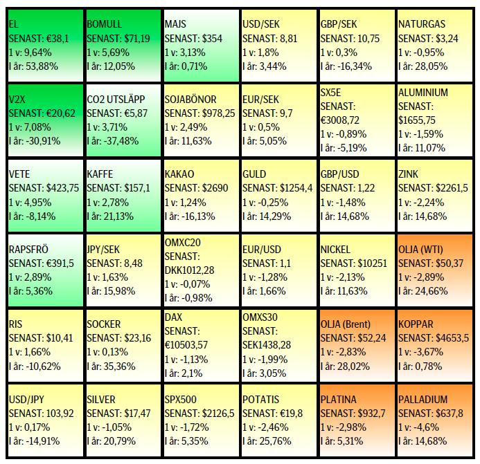 Råvaror: Oljan har kört fast i ett ganska så turbulent intervall strax under den mycket viktiga nivån $54,12/fat. Vi anser att på kort sikt så är uppsidan hursomhelst begränsad med ökat utbud från framför allt Libyen. En allt starkare dollar bör också vara en motvind för oljepriset. Metaller och framför allt koppar har fallit sedan förra veckan och vi tror inte säljandet är färdigt för vare sig koppar eller guld. Kol, utsläppsrätter och el har alla fortsatt att visa styrka och inget slut på rörelsen kan skönjas än. En allt sämre hydrobalans för Norden ger också stöd till elpriset. Efter en del volatilitet runt förra veckans WASDE rapport så fann majs/vete/sojabönor förnyad styrka och vi ser mer potential när vi tittar en bit framåt.