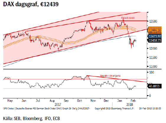 Förutom oklarheten över huruvida SDP’s medlemmar överhuvudtaget kommer att rösta ja till en ny storkoalition så har vi nu partiledarbyte i SDP samt rykten om dito i CDU. Osäkerheten tynger helt klart riskaptiten. Ur teknisk synvinkel är det alltid oroande när en reaktion (än så länge) inte ens orkar tillbaka till brottet av en längre kanal. Beteendet pekar på ett ytterst svagt köpande och en låg riskaptit.