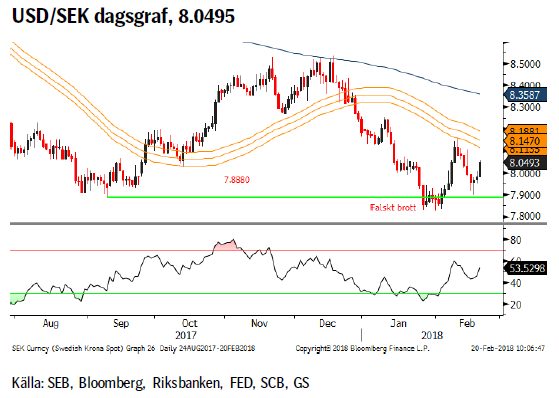 Svagare än förväntad svensk inflation, en ökad oro över det italienska valet och tysk inrikespolitik är sannolikt tillräckligt för att både försvaga kronan något samt stärka dollarn. USD/SEK bör följaktligen kunna få en skjuts uppåt. Speciellt intressant blir det om vi, med en högre botten i bagaget, skulle lyckas bryta över den senaste korrektionstoppen, 8.16.
