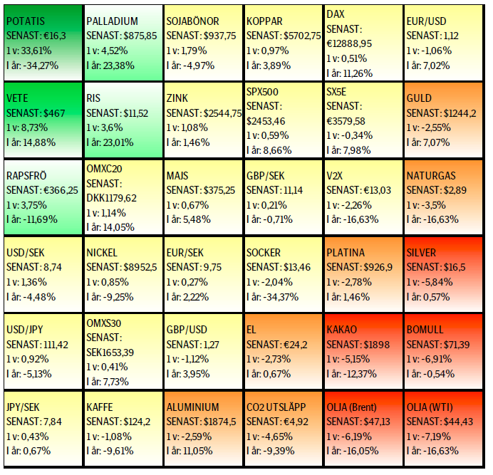 Råvaror: Oljan fortsätter att ha det motigt och priset har följaktligen fortsatt söderut. IEA estimaten pekar på att efterfrågan på OPEC olja varit 32,1m fpd under första halvåret, vilket är i princip vad man producerat, vilket förklarar den marginella lagerneddragningen. För andra halvåret prognosticerar man en efterfrågan om 33,4m fpd vilket om det visar sig stämma bör snabba på lagerneddragningen. Basmetallerna har efter en ny botten börjat korrigera. Nickel bör ha sämst potential. Risk för torka i mellanvästern har lyft vetepriset. Större etanollager har dock hållit tillbaka majspriset, trots risken för torka. Kaffepriset är fortsatt svagt trots frostvarningar på sina håll i Brasilien. Potatisen har fortsatt sitt rally, förra veckan med en uppgång om cirka 30 %.