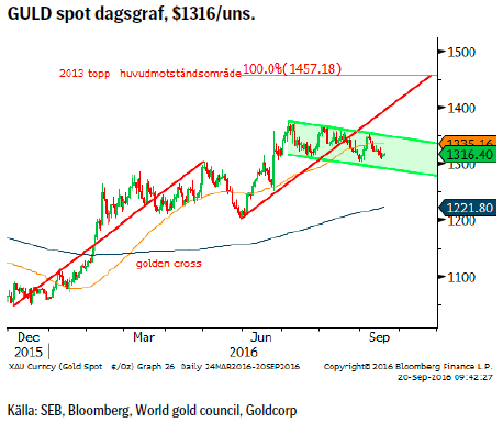 Marknaden befinner sig fortfarande i det kontrakterande intervall som vi förutspått ska hålla sig fram tills det informella OPEC-mötet i Alger den 26-28 september. Dock har prisbilden försvagats något i och med fallet ned under $47,00. Förra veckans rapport från EIA visade att antalet borrade men inte igångsatta källor (s.k. DUC’s, (drilled but uncompleted)) fortfarande är många och trots en viss nedgång det senaste halvåret ligger balansen på en historiskt hög nivå. Detta är källor som snabbt kan komma igång om priset skulle stiga.