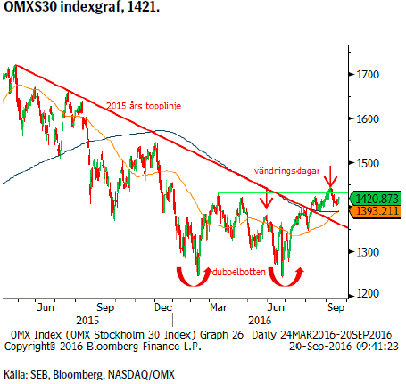 Den negativa vändningsdagen den sjätte september har än så länge levererat förväntat resultat dvs. fallande priser. Nedgången har dock skett under ordnade former vilket indikerar att denna är av korrektiv art. Det är dock ännu för tidigt att blåsa faran över och ett test ned i 1397 – 1370 området är fortfarande en realitet.