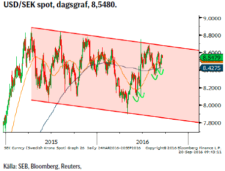 Valuta: Dollarn har stärkt på sig sedan förra veckan men lär nu ta en paus till onsdag kväll när FOMC kommer med sitt räntebesked. SEK fortsätter att handla på den svaga sidan (budgeten idag lär inte heller innehålla någon kioskvältare) och förra veckans bubblare, JPY/SEK har nu brutit upp ur sin positiva triangel. NOK/SEK fortsätter också att steg för steg ta sig norrut.
