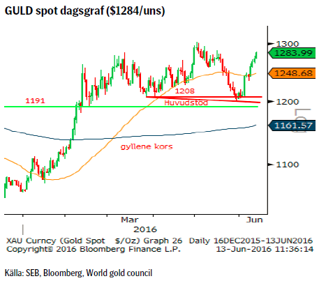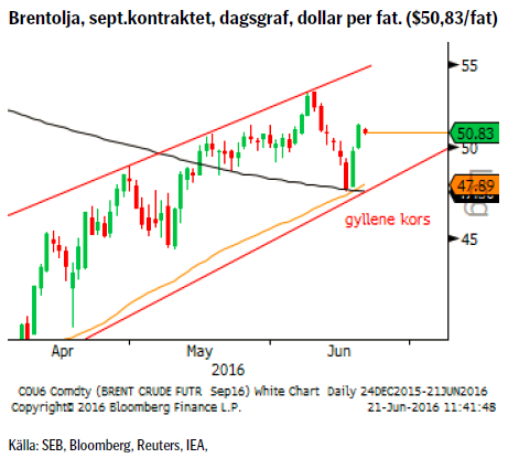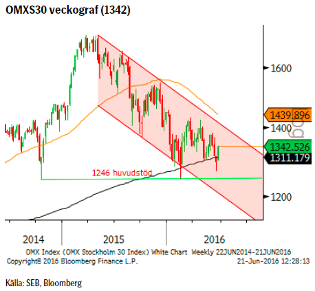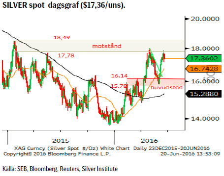 Just nu råder fullt fokus på torsdagens folkomröstning i Storbritannien. Efter att lämnasidan haft ett visst övertag i mitten av förra veckan (vilket ju väl märktes på fallande börser/olja/räntor och stigande dollar/yen/ädelmetaller) så ser läget just nu ut att peka mot ett stannaresultat. FED lämnade också som förväntat styrräntan oförändrad vid förra veckans möte (lämnar Storbritannien EU så blir det absolut ingen höjning i juli heller). På fredag kommer beskedet om hur intresserade Eurozonsbanker är att låna från ECB (€50 miljarder i den första TLTRO-II tranchen) till 0 % (räntan blir negativ om bankerna i sin tur ökar sin utlåning med viss procent).