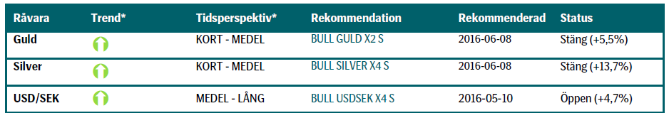 Råvaror: Oljepriset har sedan förra veckan gjort den korrektion (från kanaltak till kanalgolv) som vi primärt sökte. Elpriset ser nu ut att äntligen komma ned något. Guld och silver är efter förra veckans uppgång i en konsoliderings/korrektionsfas (inför omröstningen tar vi vinst och söker ett nytt läge att gå långa). Vete ser väldigt mjukt ut. Kaffe, soja, majs och bomull är fortsatt i efterfrågan.