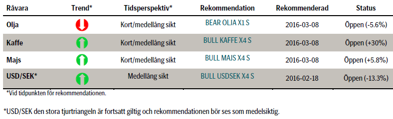 Råvaror: Fortsatta problem för olja och metaller att stiga vidare vilket gör att risken fortsatt ligger på nedsidan. Kaffe och socker ser fortsatt starka ut även om även dessa kan drabbas av vinsthemtagningar inför Påsk.