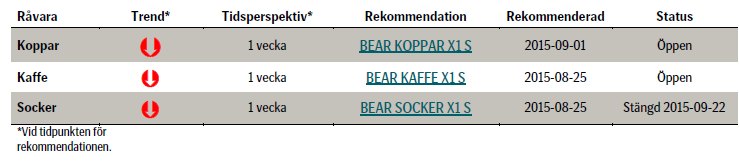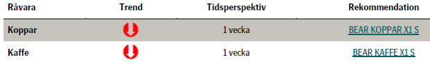 Sammantaget har som vi har prognosticerat också kaffepriset vänt nedåt. Sedan stängning i tisdags förra veckan är det ned 1,9 procent. Dock har US-dollarn försvagats mot kronan sedan vi initierade rekommendationen, vilket gör att den positiva effekten för en ägare av ett kort certifikat är begränsad. På grund av de motstridiga uppgifterna och den påföljande höga volatiliteten står vi nu inför valet att ta hem vinsten eller ligga kvar och vänta på effekterna av en svagare real. Den som är osäker på en eventuell försvagning av realens effekt på kaffepriset bör stänga sin rekommendation. Vi har den dock öppen en vecka till för ytterligare effekt, men bevakar priset noga och stänger vår position om den börjar gå åt fel håll.