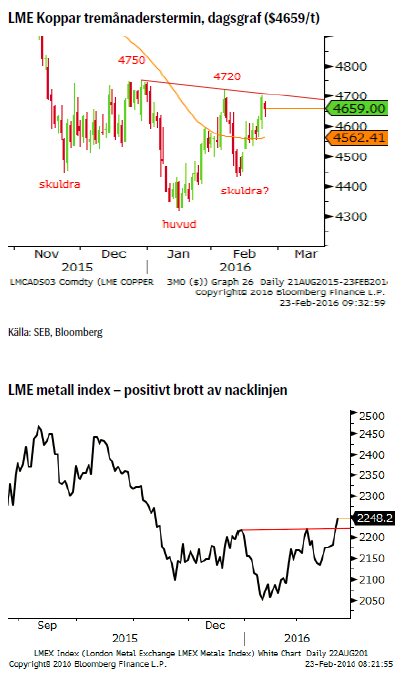 Förra veckans positiva sentiment fortsätter även denna vecka. LMEs basmetallindex har brutit upp ur en bottenformation så en mer generell metallrekyl ser ut att vara i görningen. Fram till första mars bör vi också förvänta oss ytterligare utspel avseende förra veckans överenskommelse(?) om att frysa oljeproduktionen inom delar av OPEC (t.ex. besöker Nigerias president Saudiarabien denna vecka).