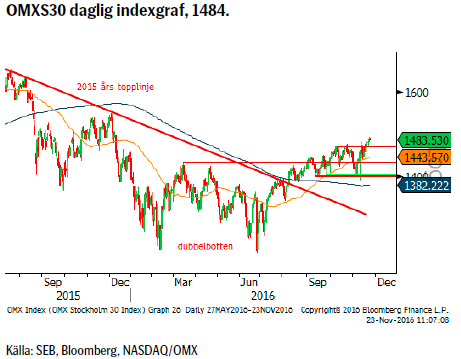 Äntligen, får vi väl lov att säga, har vi lyckats att passera 1465 – 1473 området men det tog ett antal misslyckade försök innan så skedde. Marknaden verkar nu ha tagit till sig ett tillväxtscenario (under Trump’s ledning) och ignorerar därför också ränteuppgången. Brottet är positivt och framför allt så om vi lyckas stänga november över 1473, vilket skulle skapa en positiv månadssignal (både nov och dec är har ju en klar övervikt av stigande kurser sett under de tio senaste åren).