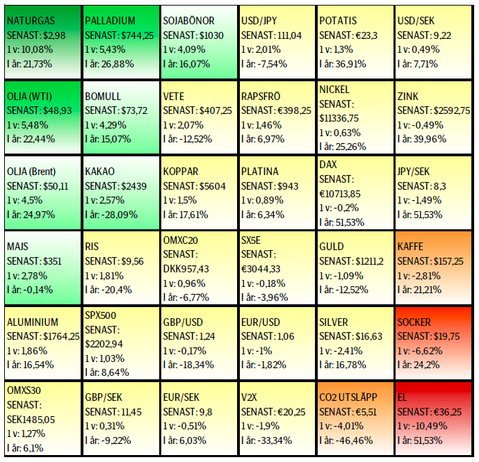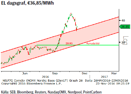 Råvaror: Kommande veckas huvudattraktion lär bli OPEC mötet den sista november. Intensiva förhandlingar pågår för närvarande och i huvudsak så med Iran och Iraq som ännu inte verkar ha accepterat förslaget om produktionsbegränsningar. Skulle man misslyckas med att komma överens väntar lägre oljepriser och en längre väg till balans mellan utbud och efterfrågan. Lyckas man komma överens vill man inte ha upp priset för mycket för då kommer amerikansk skifferolja tillbaka i än snabbare takt. Industrimetaller är fortfarande i efterfrågan men i vissa fall motsvarar inte priset längre fundamentala faktorer varför det är lite bubbelvarning inom segmentet (kinesiska spekulanter är en huvudsaklig drivkraft). Elpriserna har korrigerat kraftigt lägre pga. ovanligt milt och blött väder, men vintern står i antågande och grundläggande problem kvarstår så frågan är väl snare när än om vi får en reaktion uppåt igen.