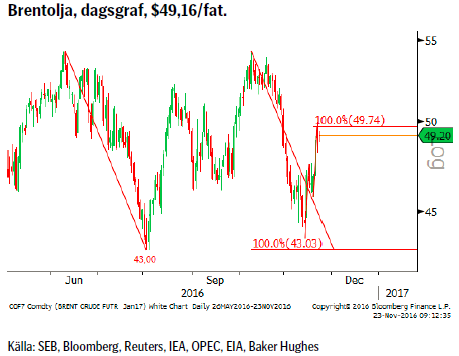 Råvaror: Kommande veckas huvudattraktion lär bli OPEC mötet den sista november. Intensiva förhandlingar pågår för närvarande och i huvudsak så med Iran och Iraq som ännu inte verkar ha accepterat förslaget om produktionsbegränsningar. Skulle man misslyckas med att komma överens väntar lägre oljepriser och en längre väg till balans mellan utbud och efterfrågan. Lyckas man komma överens vill man inte ha upp priset för mycket för då kommer amerikansk skifferolja tillbaka i än snabbare takt. Industrimetaller är fortfarande i efterfrågan men i vissa fall motsvarar inte priset längre fundamentala faktorer varför det är lite bubbelvarning inom segmentet (kinesiska spekulanter är en huvudsaklig drivkraft). Elpriserna har korrigerat kraftigt lägre pga. ovanligt milt och blött väder, men vintern står i antågande och grundläggande problem kvarstår så frågan är väl snare när än om vi får en reaktion uppåt igen.