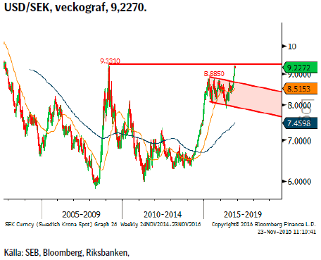Valuta: Dollarn fortsätter att vara väldigt efterfrågad, inte minst från tillväxtmarknader. Inför FED mötet så finns väl möjligheter till fortsatt uppgång men med en höjning i priset finns fallhöjd om så inte skulle bli fallet. USD/SEK fortsätter att stiga men som tänkt med långsammare takt då kronan inte längre faller mot euron.
