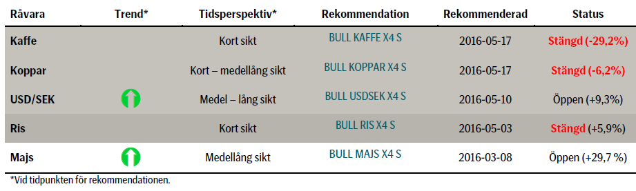 Valuta: Dollarn tillsammans med yenen fortsätter att visa styrka och vi förväntar oss mer av båda två, favoritpositionen är dock fortsatt lång BULL USDSEK då vi även ser en viss fortsatt kronförsvagning framför oss. BULL/BEAR GBPSEK kan bli intressanta certifikat för den som har en vy på den kommande brittiska folkomröstningen.