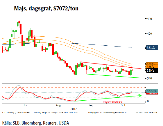 Efter en närmast konstant nedgång sedan i somras så ser vi nu några tidiga tecken på en eventuell vändning/korrektion. Den nordamerikanska skörden är försenad då bara 38 % av majsen är bärgad jämfört med ett snitt på 59 % för de senaste fem åren. Det amerikanska jordbruksdepartementet har justerat ned arealavkastningen för soja vilket också fick majspriset att reagera uppåt. Priset har varit så nedtryckt att det nu finns förväntningar om att vi nästa år kan se producenter ställa om till andra grödor varför det finns en begynnande tro att det värsta nu kan vara över. Spannmålspriserna har nu fallit så mycket och så länge att handlare nu lämnar marknaderna i USA rapporterar Bloomberg – ett vändningstecken?
