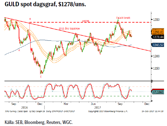 Tankarna från förra veckan om att korrektionen upp till 55dagars bandet var avslutad har än så länge visat sig ha bäring. En försiktigt stigande dollar är det huvudsakliga skälet till detta och då vi fortsatt tror på ytterligare dollarkorrektion så blir det svårt att inte ha en negativ syn på guldet kommande månad (under november så har dollarn stigit åtta av de senaste tio åren). Dollarn har också fått stöd av att sannolikheten för en skattereform i USA stigit den senaste tiden. Fed lär också fortsätta höja räntan i december.