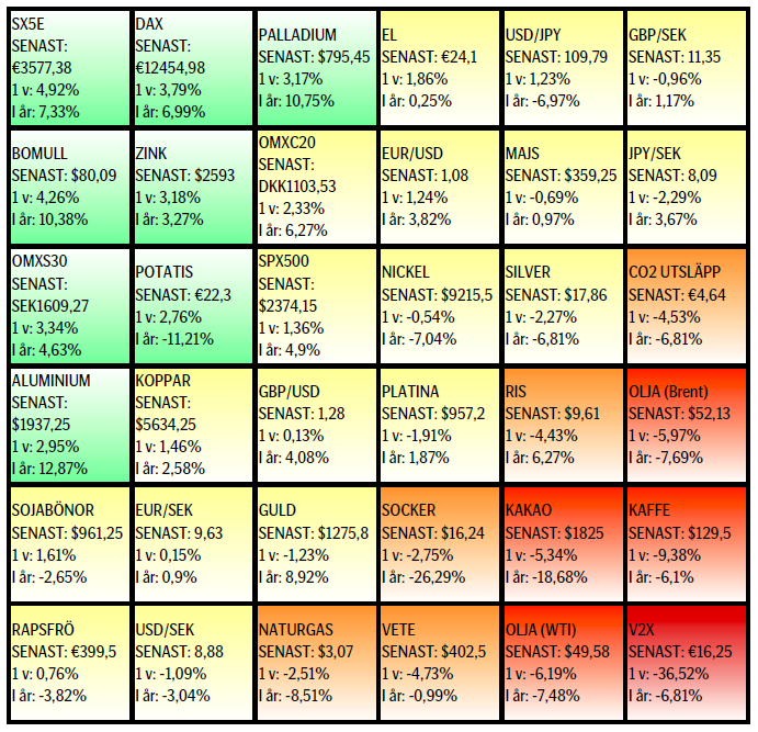 Valuta: Dollarn fortsätter att försvagas mot de flesta valutor och ytterligare försäljningar lär nog ske i det kortare tidsperspektivet. Dock så har USD/JPY vänt upp från sin korrektion och bör bara vara i början av en ny uppgångsfas, tror vi. Pundet har förstärkts en del efter utlysandet av nyvalet i juni men varar styrkan? GBP/SEK certifikat kan vara intressanta inför valet (lyssna på Richard Falkenhäll i veckans film där han talar Brexit).
