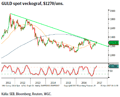 Råvaror: Oljeprisets återhämtning kom snart av sig och sedan mitten av april har det mesta av uppgången raderats. Utvecklingen bör vara lite oroväckande för alla de med spekulativa långa positioner. Det kommande, 25/5, OPEC mötet bör dock kasta en skugga över marknaden och som sådant erbjuda ett stöd. Basmetallerna ser ut att möjligtvis ha klarat av den senaste korrektionen och den ökade riskaptiten i kölvattnet första omgången av det franska presidentvalet hjälper till. Dock tror vi inte att återhämtningen för järnmalm varar någon längre stund, ökat utbud sätter press på priset. Guldet blev inför det franska valet väl överköpt och konsoliderar/korrigerar följaktligen. Kaffe, kakao, vete och majs har varit under fortsatt press.