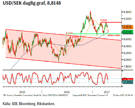 Så har då den första omgången av det franska presidentvalet klarats av och med det mest förväntade utfallet. Så lär också ske i den andra omgången den 7 maj. Dock bör man ha klart för sig att vem som än väljs som president så lär denna inte få någon lätt resa då resultatet efter parlamentsvalen i juni troligtvis lär resultera i att Frankrike kommer att ha en president ”utan” parlament dvs. olika kulör på de båda, ett recept för osämja. Brittiska Labour flaggade idag för en ny Brexit-omröstning om utfallet av förhandlingarna skulle bli för dåliga för Storbritannien. Nu lär ju inte Labour vinna parlamentsvalet i juni. På torsdag har vi Riksbanksbeskedet men ingen ränteförändring förväntas, var dock vaksam på om man tar bort den lilla guidning (6 baspunkter) för lägre räntor som man fortfarande har kvar då detta lär få en effekt på kronan.