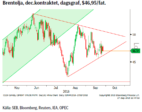 Marknaden spelar fortfarande enligt vår grundplan, det allt snävare intervallet (stigande bottnar och fallande toppar). Det informella OPEC mötet i Alger som i skrivande stund pågår förväntas inte leda till någon signifikant överenskommelse (en sådan torde ha större chans att lyckas vid nästa ordinarie OPEC möte den 30:e november).