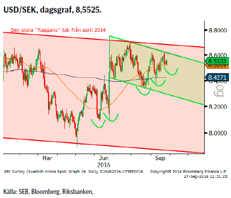 Trots att dollarn, efter Fed’s förväntade besked att än en gång skjuta nästa räntehöjning framåt, tappade så tappade den dock mindre mot SEK än mot många andra valutor. Den underliggande kronsvagheten syns därigenom än tydligare (Konjunkturinstitutets kronindex, KIX, stängde förra veckan på ett års högsta). Svagare svensk statistik bör också framgent bidra till att USD/SEK, vid nästa dollaruppgång, bör fortsätta att stiga med (naturlig) hävstång (starkare dollar och svagare krona).