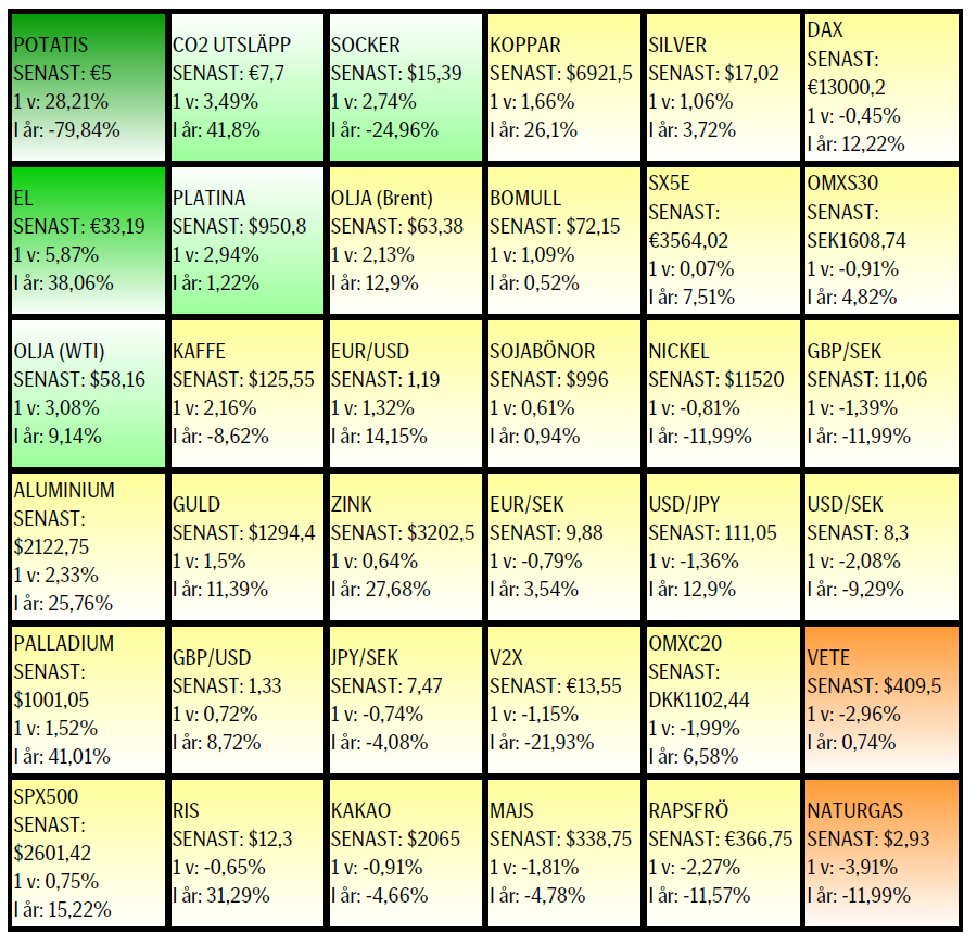 Råvaror: Så är det då strax dags för OPEC-mötet (OPEC + 10 icke medlemmar där Ryssland naturligtvis är den viktigaste) 30/11 där frågan huruvida man ska eller inte ska förlänga innevarande produktionsbegränsningar ska dryftas. Saudiernas förslag till förlängning, efter 31/3, verkar finna stöd även om Ryssland inte till fullo givit sitt verbala stöd. Ett alternativ vore att man inte tar ställning nu utan hänvisar till fortsatt bevakning av utvecklingen och ett besked under kvartal ett. Marknaden skulle sannolikt tolka ett sådant besked negativt, även en kortare förlängning än nio månader skulle ses som negativt. Givet marknadens stora långa nettopositionering måste nog en viss nedåtrisk vara större än det omvända. Industrimetallerna har klättrat något under de senaste tio dagarna men uppgången ser helt klart korrektiv ut. Kinesiska räntor är åter i stigande vilket riskerar att kyla av framför allt fastighetssektorn, något som säkerligen applåderas i Beijing nu när partikongressen är passerad. Kol, el och utsläppsrätter har alla klättrat något sedan förra veckan. Kakao är nu tillbaka för att testa validiteten i det tidigare positiva brottet av 55d mv bandet. Socker som repat sig från botten i början av oktober (då EU’s sockerkvotspolitik gick i graven) möter nu säljare då priserna givet den nu fria produktionen inom EU lär pressa priset framgent. Veckans vinnare blev potatis med +28%.