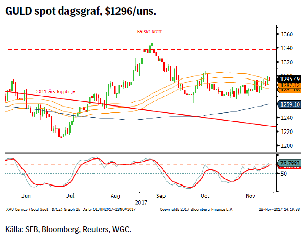 Brentolja, dagsgraf, $63.24/fat.Det har varit relativt tyst från Saudiarabien sedan arresteringsvågen av de korruptionsanklagade. Flertalet befinner sig fortfarande inlåsta. Dock är ju fokus denna vecka helt och fullt på torsdagens möte mellan OPEC och inbjudna icke medlemmar. Vi står kvar vid vår tidigare kommunicerade vy om att ingen bindande överenskommelse sker på torsdag. Sannolikt får vi ett antal orsaker och anledningar till att skjuta upp beskedet till februari/mars. Det är troligen ett vist beslut då det råder stor osäkerhet om hur oljemarknaden kan komma att utvecklas under 2018 så ju mer kött man har på benen desto bättre. Hursomhelst så är marknaden tungt positionerade för fortsatta begränsningar varför en besvikelse lätt kan leda till kortsiktigare försäljningar.