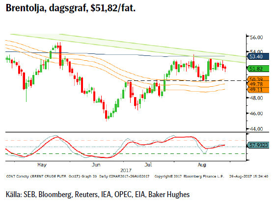 Inte mycket har hänt under den senaste veckan trots dollarnedgången och orkanen i Houston. Det ser ut som om marknaden för närvarande funderar över sådana fakta som att antalet borriggar föll för andra veckan i rad, vad orkanen kan få för påverkan på efterfrågan från raffinaderierna samt vad som nu händer när den amerikanska ”driving season” går mot sitt slut. Framändan på oljekurvan är nu i ”backwardation” dvs. spotpriset är högre än de närmast kommande terminskontrakten indikerandes en bättre efterfrågan i nutid, implikationerna bör vara ytterligare fallande lager (som dock fortfarande är stora). Enligt EIA steg också amerikansk produktion med ytterligare 79k fpd förra veckan.