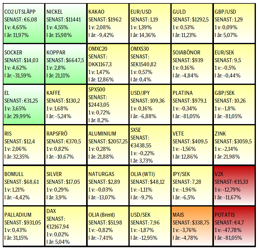 Råvaror: Översvämningarna i USA bör drabba raffinerade produkter som bensin mer än oljan då raffinaderierna drabbats mer än råoljeproduktionen. Bensinpriset steg också fortsatt (både en stark ”driving season” och orkanen) nästan till årshögsta Antal borriggar föll återigen, denna gång med fyra stycken och sex veckors snittet är nu negativt (-0.3). Den långa spekulativa nettopositioneringen föll under den senaste rapportperioden både i WTI och Brentoljan. Skillnaden mellan de två kontrakten har vidgats till den största på länge. Industrimetallerna som vi ju förra veckan tyckte stigit väl fort har, förutom koppar, visat utmattningstecken. Vi vidhåller att korrektionsrisken är fortsatt stor. Guldet har på baksidan av den svagare dollarn och politisk instabilitet gjort ett nytt brott på uppsidan och i skrivande stund ser detta försök ut att lyckas bättre än det förra. Dock är marknaden överköpt så en rekyl i dollarn, när den kommer bör också utlösa vinsthemtagningar för den gula metallen. Socker orkade inte ned till en ny botten utan har den senaste veckan attraherat köpare. Majs och vete har dock varit under fortsatt press. Nordiska el-terminer har också fortsatt att handlas upp. Torrare väder, dyrare kol och fortsatta underhållsarbeten på svenska reaktorer ligger bakom.