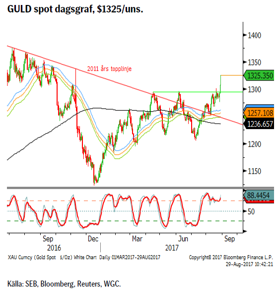 Råvaror: Översvämningarna i USA bör drabba raffinerade produkter som bensin mer än oljan då raffinaderierna drabbats mer än råoljeproduktionen. Bensinpriset steg också fortsatt (både en stark ”driving season” och orkanen) nästan till årshögsta Antal borriggar föll återigen, denna gång med fyra stycken och sex veckors snittet är nu negativt (-0.3). Den långa spekulativa nettopositioneringen föll under den senaste rapportperioden både i WTI och Brentoljan. Skillnaden mellan de två kontrakten har vidgats till den största på länge. Industrimetallerna som vi ju förra veckan tyckte stigit väl fort har, förutom koppar, visat utmattningstecken. Vi vidhåller att korrektionsrisken är fortsatt stor. Guldet har på baksidan av den svagare dollarn och politisk instabilitet gjort ett nytt brott på uppsidan och i skrivande stund ser detta försök ut att lyckas bättre än det förra. Dock är marknaden överköpt så en rekyl i dollarn, när den kommer bör också utlösa vinsthemtagningar för den gula metallen. Socker orkade inte ned till en ny botten utan har den senaste veckan attraherat köpare. Majs och vete har dock varit under fortsatt press. Nordiska el-terminer har också fortsatt att handlas upp. Torrare väder, dyrare kol och fortsatta underhållsarbeten på svenska reaktorer ligger bakom.