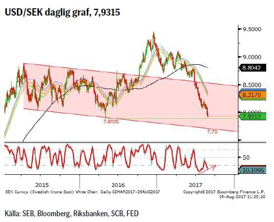 Valuta: Dollarindex har fallit till sin lägsta nivå sedan mars 2016 och USD/SEK har kommit bara några ören ifrån samma botten. Håller inte 7.8935 stödet finns en klar risk för fortsättning ned mot 7.70 området. NOK/SEK, som vi skrev om förra veckan, har stigit något och vi tycker fortfarande att den tekniska bilden ger stöd för ytterligare försök norrut. Pass upp på ECB uttalanden om den starka €.