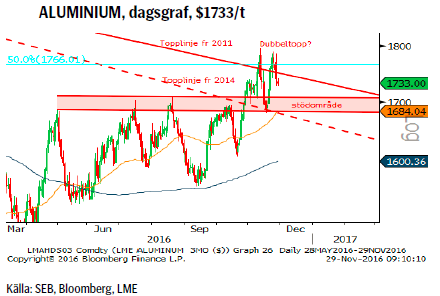 Basmetaller generellt och kanske aluminium specifikt (även koppar som vi skrivit om de senaste veckorna samt nickel och zink uppvisar liknande tecken) uppvisar en relativt hög grad av att vara ”överköpt”. Basmetaller, stålprodukter, järnmalm och många fler råvaror har drivits väl långt pga. i huvudsak kinesisk spekulation kryddad med förhoppningar om snabba infrastrukturprojekt initierade av Trump. I fallet aluminium finns även ett flertal fakta som talar för en möjlig topp (ingen brist, det höga priset leder till mer utbud och aktivare terminsförsäljning (för att låsa in ett förmånligt pris) samt att produktionskostnaden under november fallit då kol för kraftgenerering fallit med 15-20 % sedan toppen.