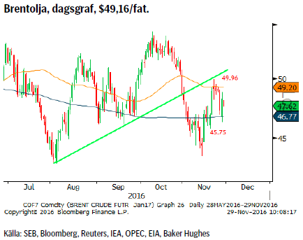 Råvaror: Oljepriset svänger upp och ned (hittills mest ned givet att förhandlingarna inför mötet verkar gå trögare än tidigare förväntat) i takt med olika uttalanden och ståndpunkter. Alla dessa uttalanden ska dock ses som delar av förhandlingsspelet. Vi anser att utfallet att nå en överenskommelse fortfarande har en liten övervikt (kom ihåg att budgetsituationen är bekymmersam för alla medlemmar och att en begränsning av produktionen inte heller lär vara annat än under en kortare period, t.ex. ett halvår). Industrimetaller har fortsatt gå upp och så har även en ädelmetall som palladium gjort men det naturligtvis beroende på kopplingen till bilindustrin. Guldet bröt igenom sitt huvudstöd men det verkar mest ha varit stoppar som gick, ingen fortsättningsförsäljning har än noterats. Utsläppsrätter för CO2 har fallit kraftigt sedan förra veckan vilket hjälpt till att pressa elpriserna.