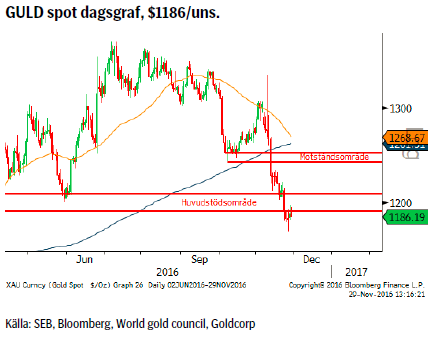 Marknaden fortsatte att sälja av guld tills vi bröt under huvudstödsområdet. Dock har inte brottet, som man skulle kunna anta, utlöst ytterligare försäljningar något som kan indikera att vi nu åtminstone nått en paus. Noterbart är också att Ryssland utnyttjat fallet under oktober till att kraftigt öka sitt guldköpande. Vi bör nu också vara ytterst nära ett officiellt beslut om den så kallade Sharia-standarden för guld, vilket på sikt bör vara en mycket positiv faktor.
