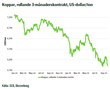 Veckan som gick var onekligen en stökig sådan. I efterdyningarna av Fed:s beslut att inte höja räntan, vilket tolkades som oro för tillväxten och efterfrågan, fortsatte världens börser att backa. Råvarumarknaden fick ytterligare skjuts nedåt av först negativa förväntningar på kinesisk PMI-data på onsdagen, vilka sedan kom in i linje med de låga förväntningarna, och sedan mer bolagsspecifika nyheter: Flera gruvbolag med Glencore och BHP Billiton i spetsen har annonserat kraftigt vikande lönsamhet och Glencores aktie har tappat sanslösa 75 procent sedan årsskiftet och 50 procent hittills under september. Det är främst de låga järnmalm- och kopparpriserna som påverkar bolagen och man annonserade att man kommer att behöva ta in mer kapital i form av aktieemission för Glencore samt obligationsemissioner för BHP Billiton. Marknaden har minst sagt reagerat kraftigt på nyheterna.